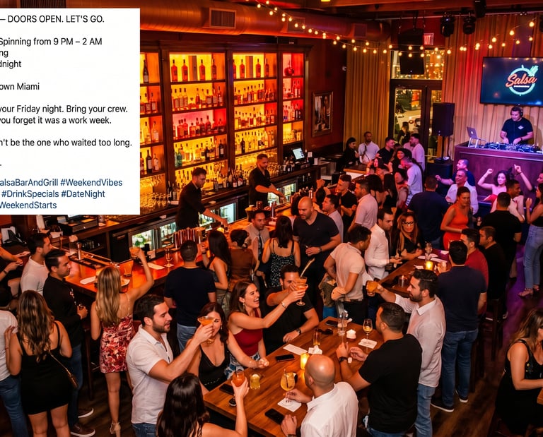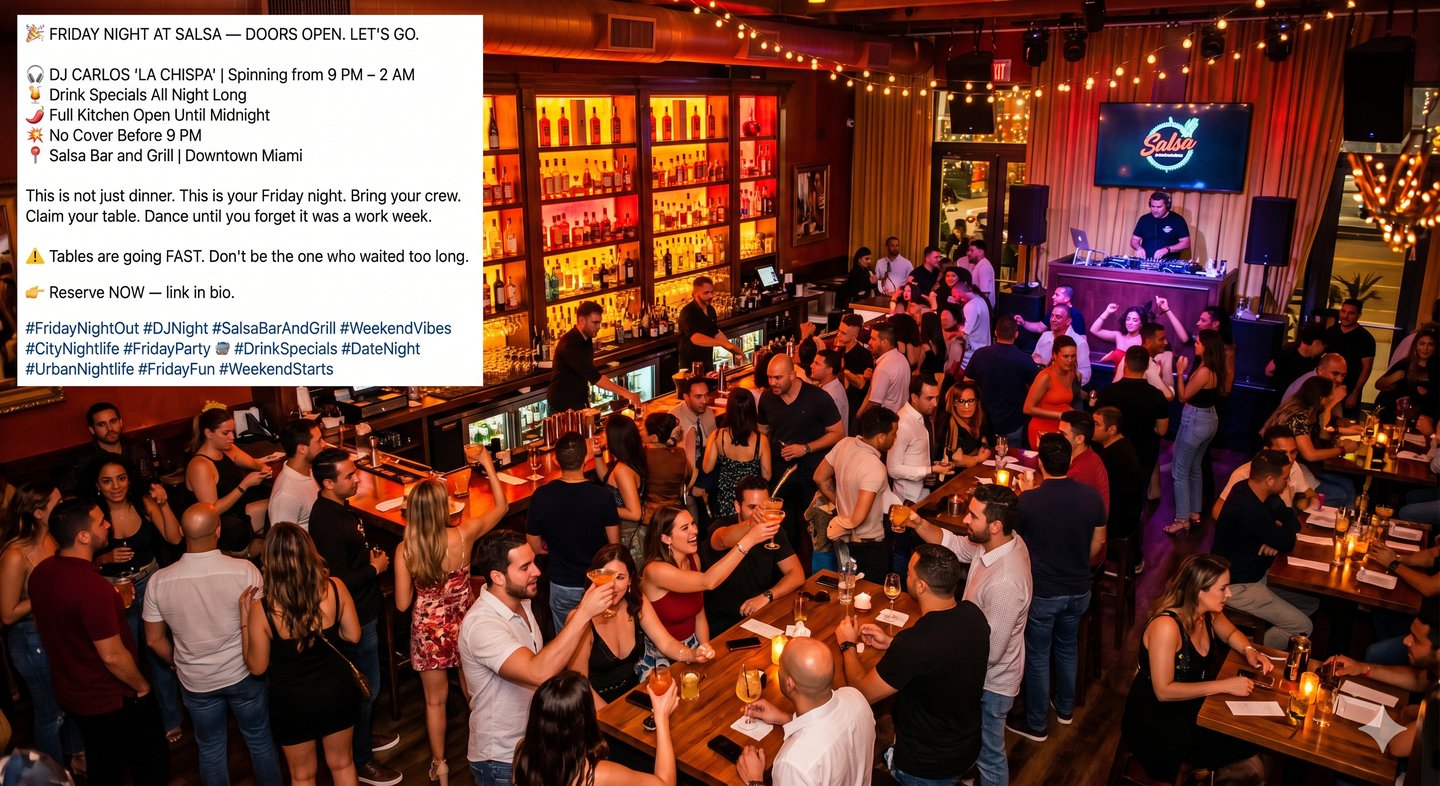 Paid-ad-ready event promotions built for nightlife and dining venues. Each caption is engineered with urgency, clear calls to action, and local hashtag strategy to maximize reach and reservations.