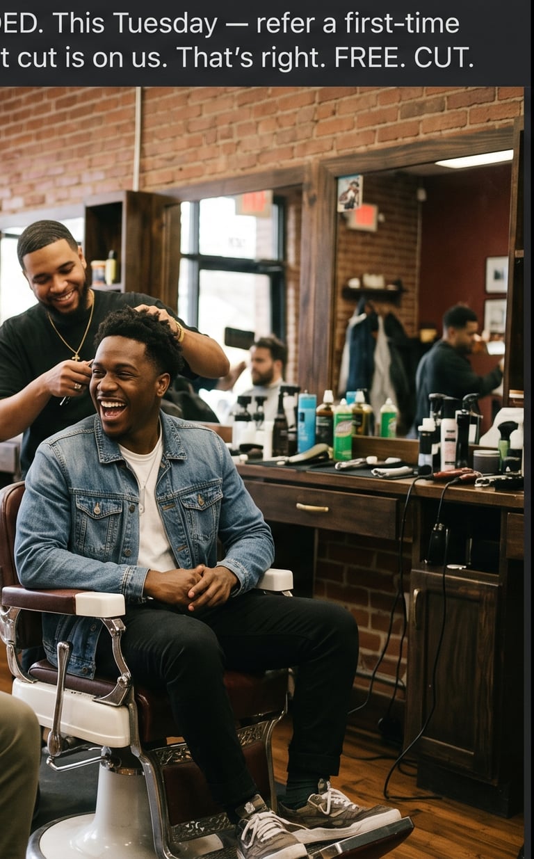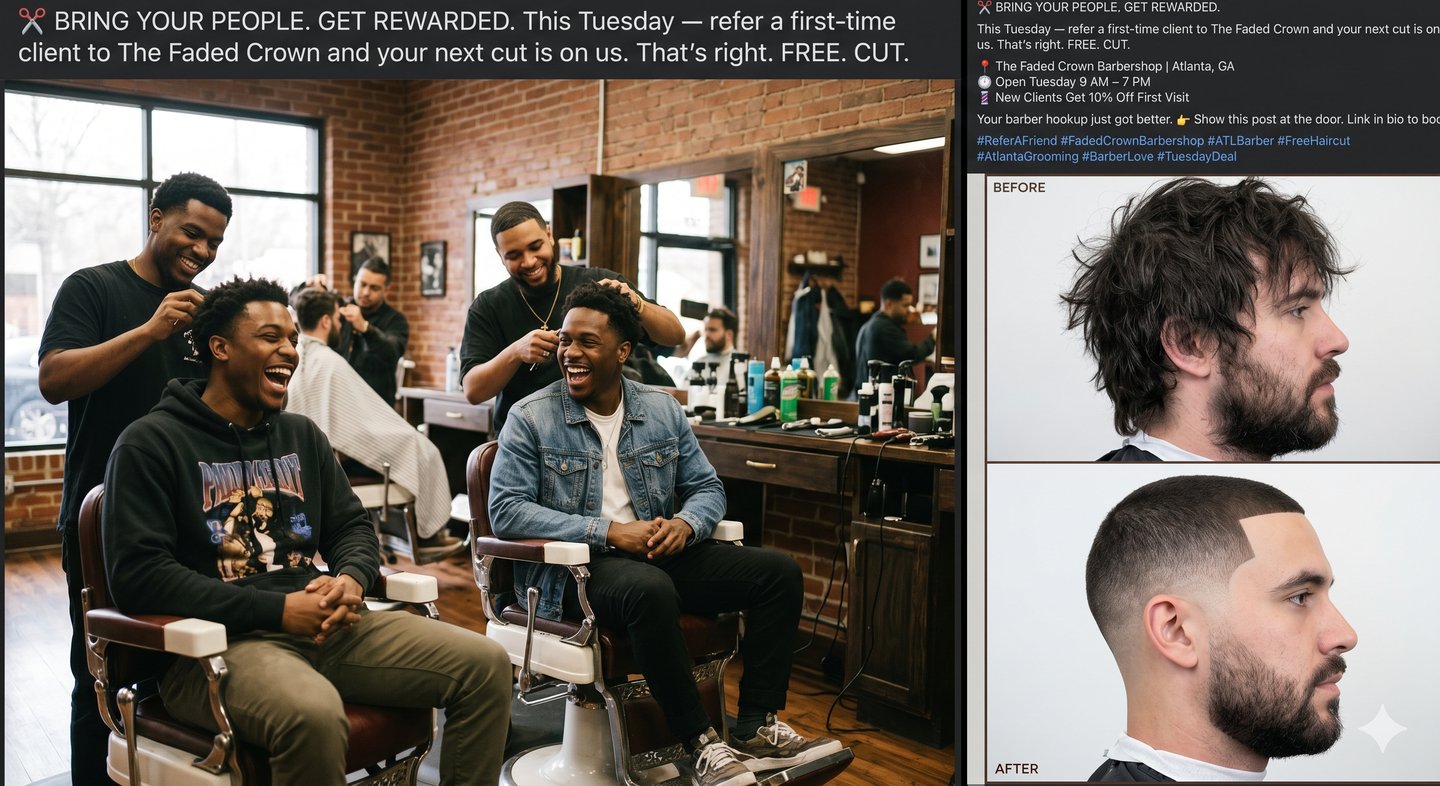 Community-driven content crafted for The Faded Crown Barbershop in Atlanta, GA. Each post combines real transformation visuals with referral-based promotions designed to grow the client base and keep loyal customers coming back every week.