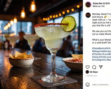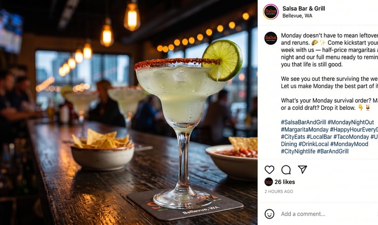 A complete Instagram content campaign crafted for Salsa Bar and Grill — a local bar and grill in a large American city. Each post blends bold visuals with community-driven captions and event promotions designed to drive real foot traffic.